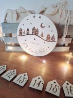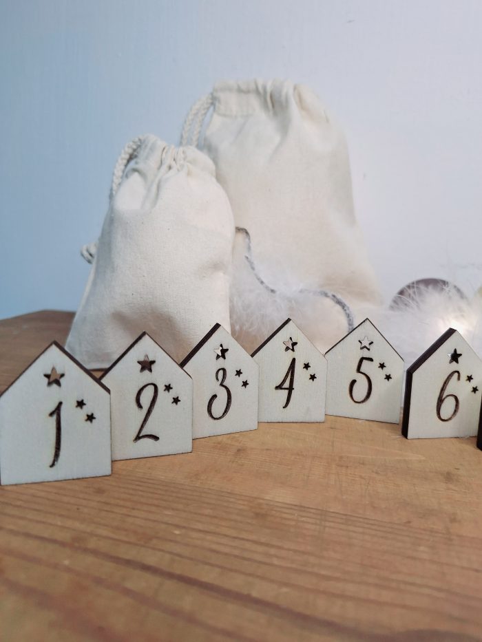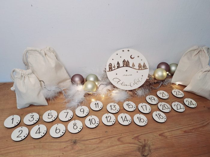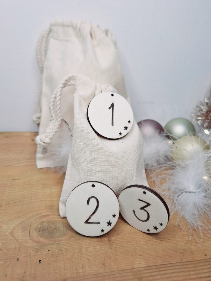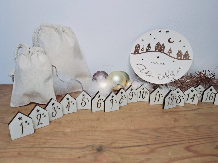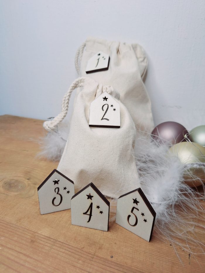 - Zahlenanhänger: Häuser (3,2 cm x 4,2 cm) oder Scheiben (Durchmesser 4,4 cm), Dicke 5 mm
