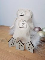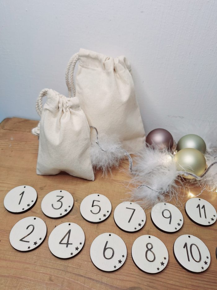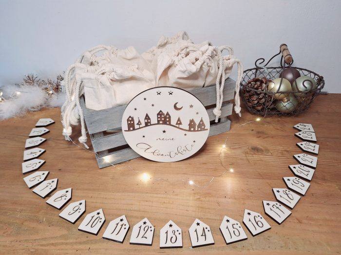 Ihr verwendet eure eigene Kiste oder ein eigenes Körbchen und stattet es mit unserem Hoamzua- Adventskisten-Bausatz aus. Im Komplettset enthalten sind ein Holzschild für deine Adventskiste, 24 Zahlenanhänger (in Hausform oder Kreise) und 24 Baumwollsäckchen mit Zugband. Die Baumwollsäckchen erhaltet ihr wahlweise in zwei Größen: klein mit den Maßen 10 x 15 cm, groß mit den Maßen 14 x 20 cm.