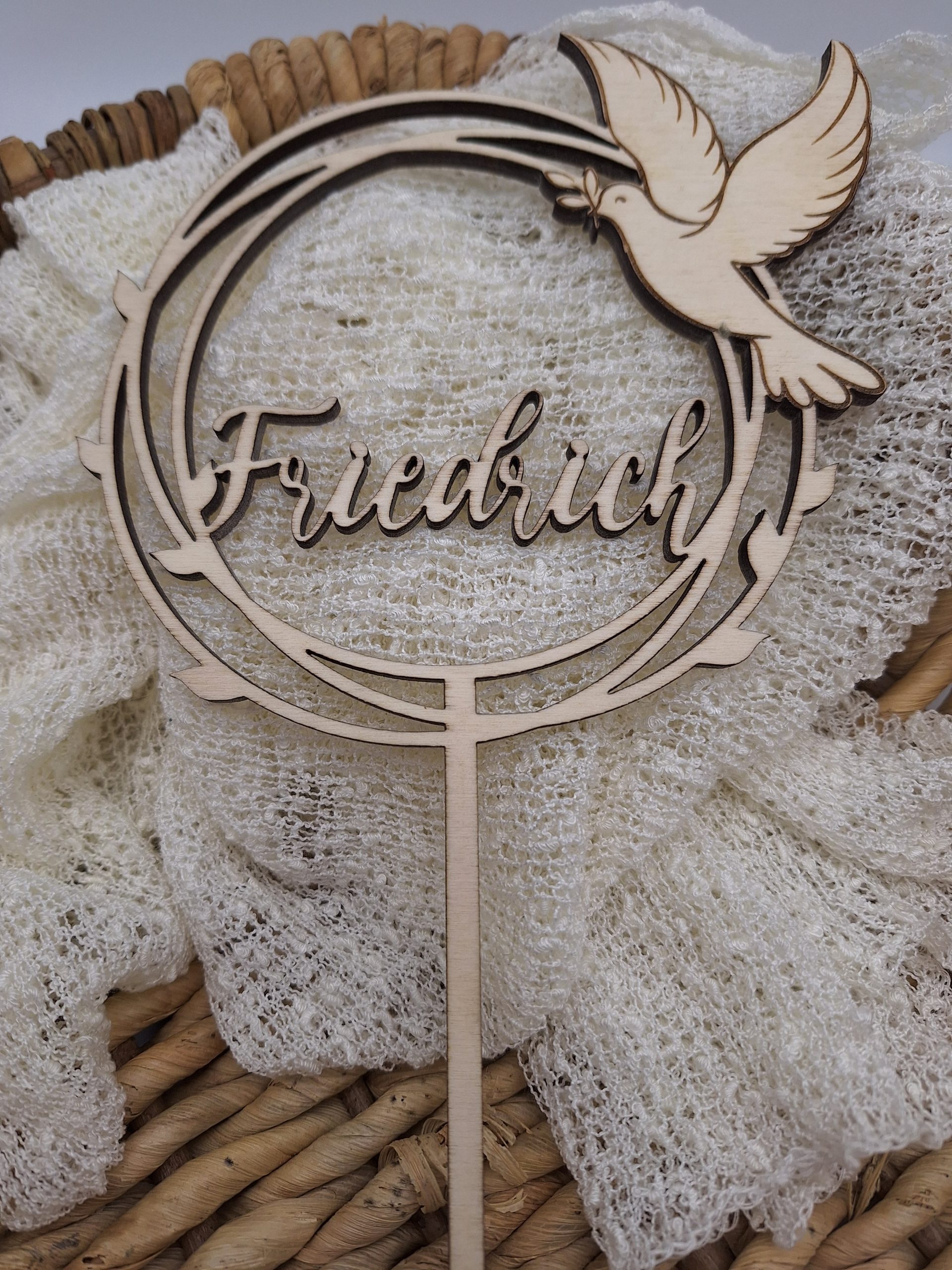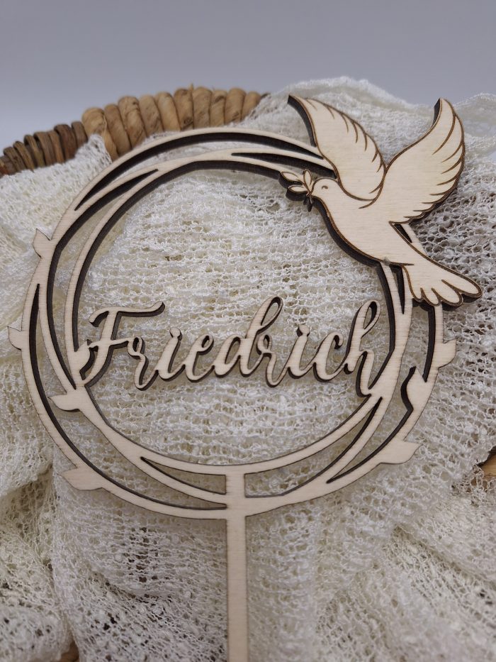 Der Cake Topper wird für dich mit dem Namen, falls gewünscht auch mit dem Datum der Taufe personalisiert. So verleiht er der Torte zur Feier eine ganz besondere Note und kann zur Erinnerung aufbewahrt werden.