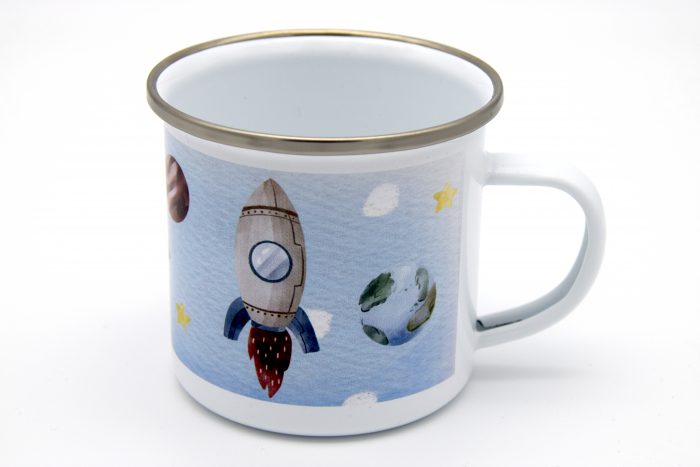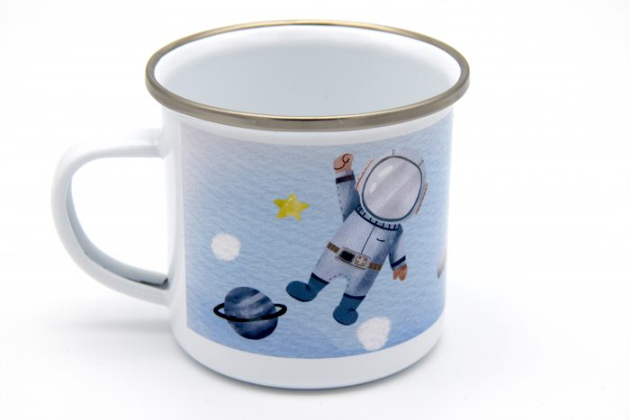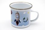 Unsere Emailletasse mit Weltraummotiv lässt die Herzen junger Astronauten höher schlagen.