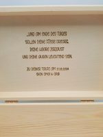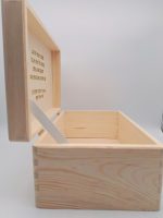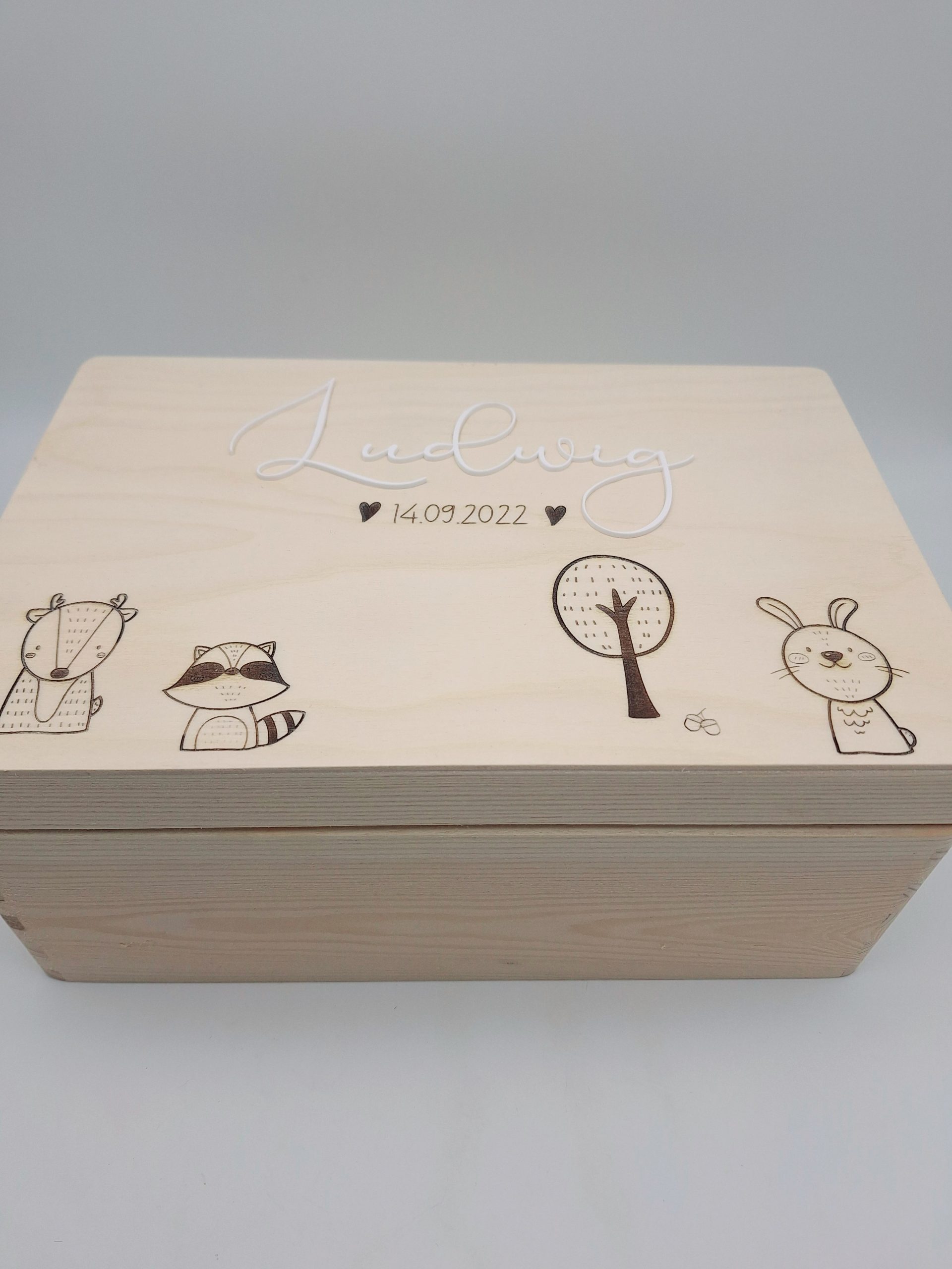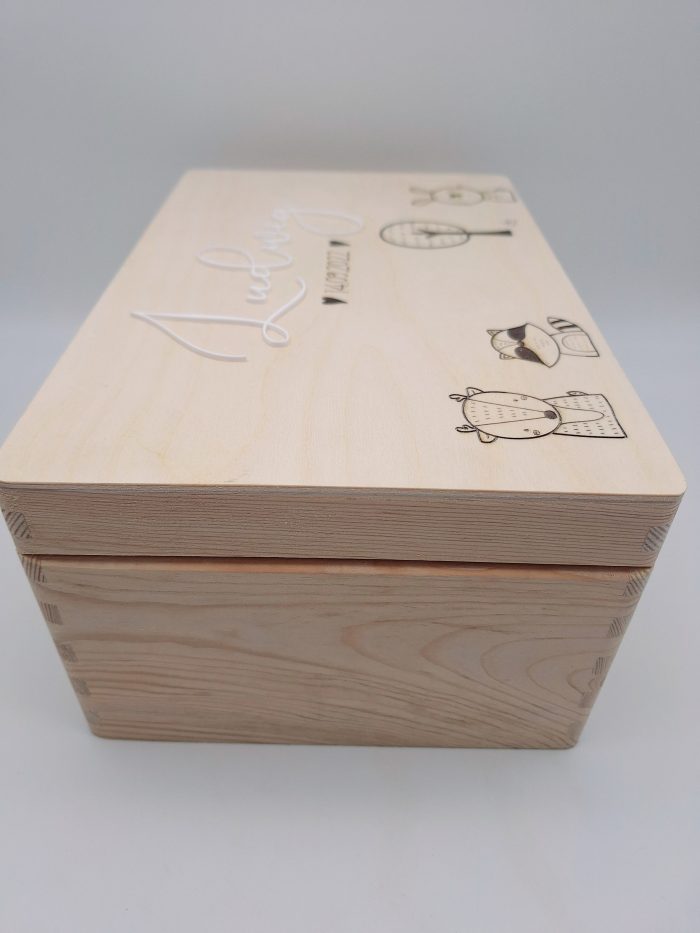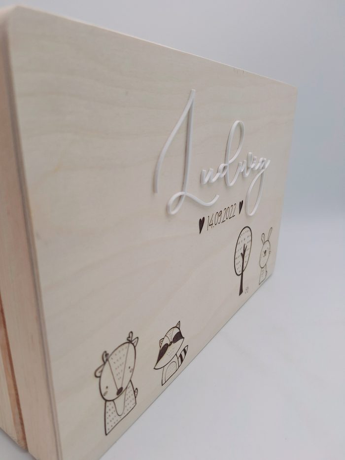 Eine individuell gestaltete Erinnerungsbox aus Kiefernholz ist ein ganz besonderes Geschenk zur Geburt, zur Taufe oder Kommunion / Konfirmation, zur Hochzeit oder auch zum 18. Geburtstag. Das Holz ist unbehandelt und stammt aus FSC-zertifizierter Forstwirtschaft in Europa. Die Herstellung der Holzkisten erfolgt frei von gesundheitsschädlichen Schadstoffen oder Chemikalien.