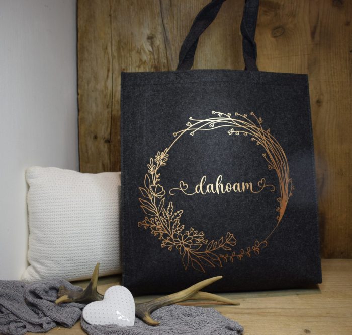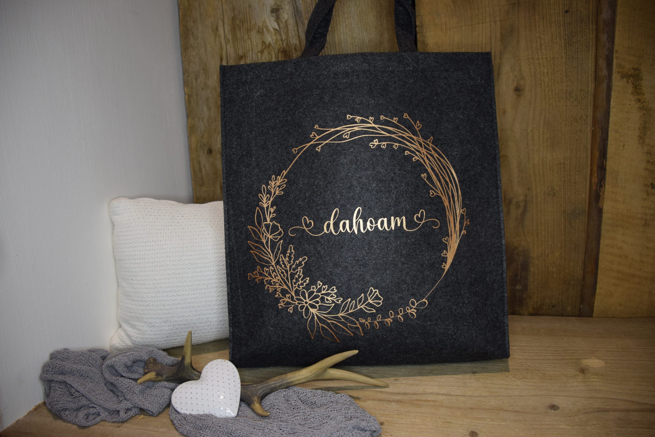 Unserer Filztasche „dahoam“ ist ein treuer Begleiter auf deinen Einkaufstouren oder Ausflügen. Die Henkel sind 58 cm lang, daher kann sie als Schulter- oder Tragetasche genutzt werden. Sie ist ein wunderbares Mitbringsel für deine beste Freundin, Mama, Schwester…