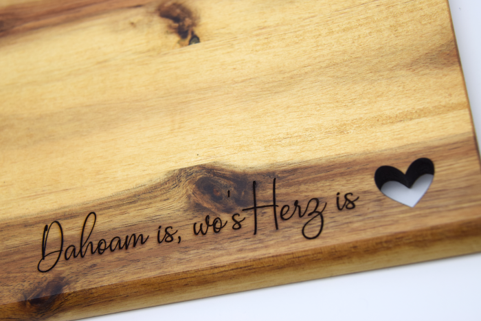 Brotzeitbrettchen aus Akazienholz mit Lasergravur „dahoam is, wo’s Herz is“ und kleinem Herzausschnitt.