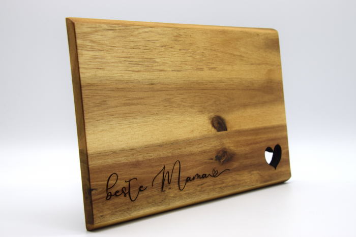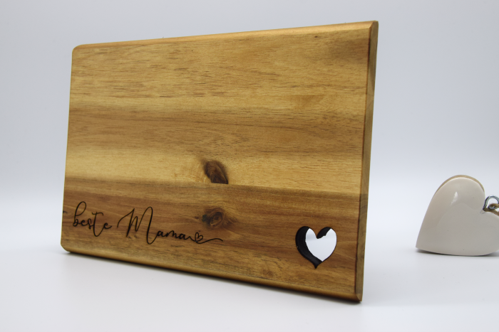 Brotzeitbrettchen aus Akazienholz mit Lasergravur und Herzausschnitt für die beste Mama.