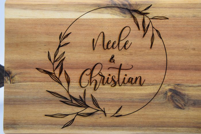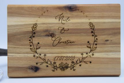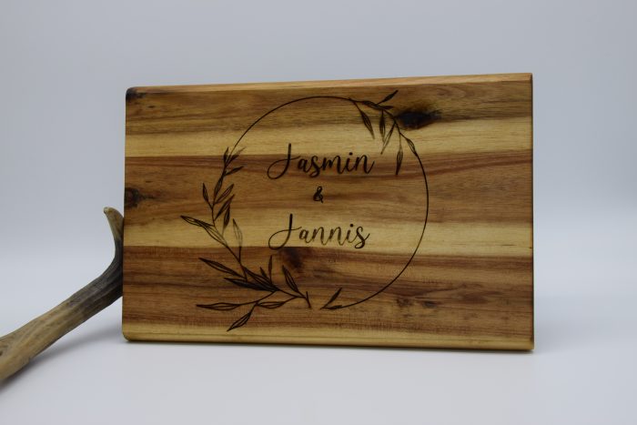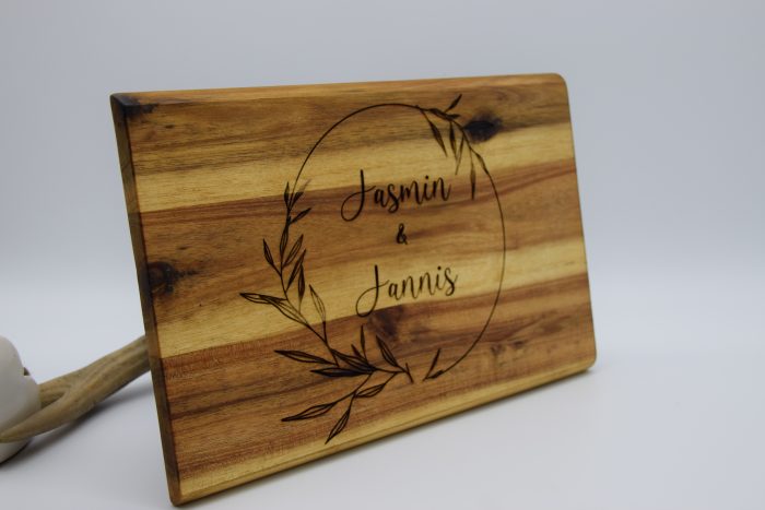 In das Brotzeit-Brettchen aus Akazienholz werden eure Namen eingraviert – damit kann der Start in den Tag für alle Verliebten perfekt beginnen. Es ist ein wunderschönes Geschenk zur Hochzeit, zum Geburtstag oder zum Einzug ins neue Zuhause.