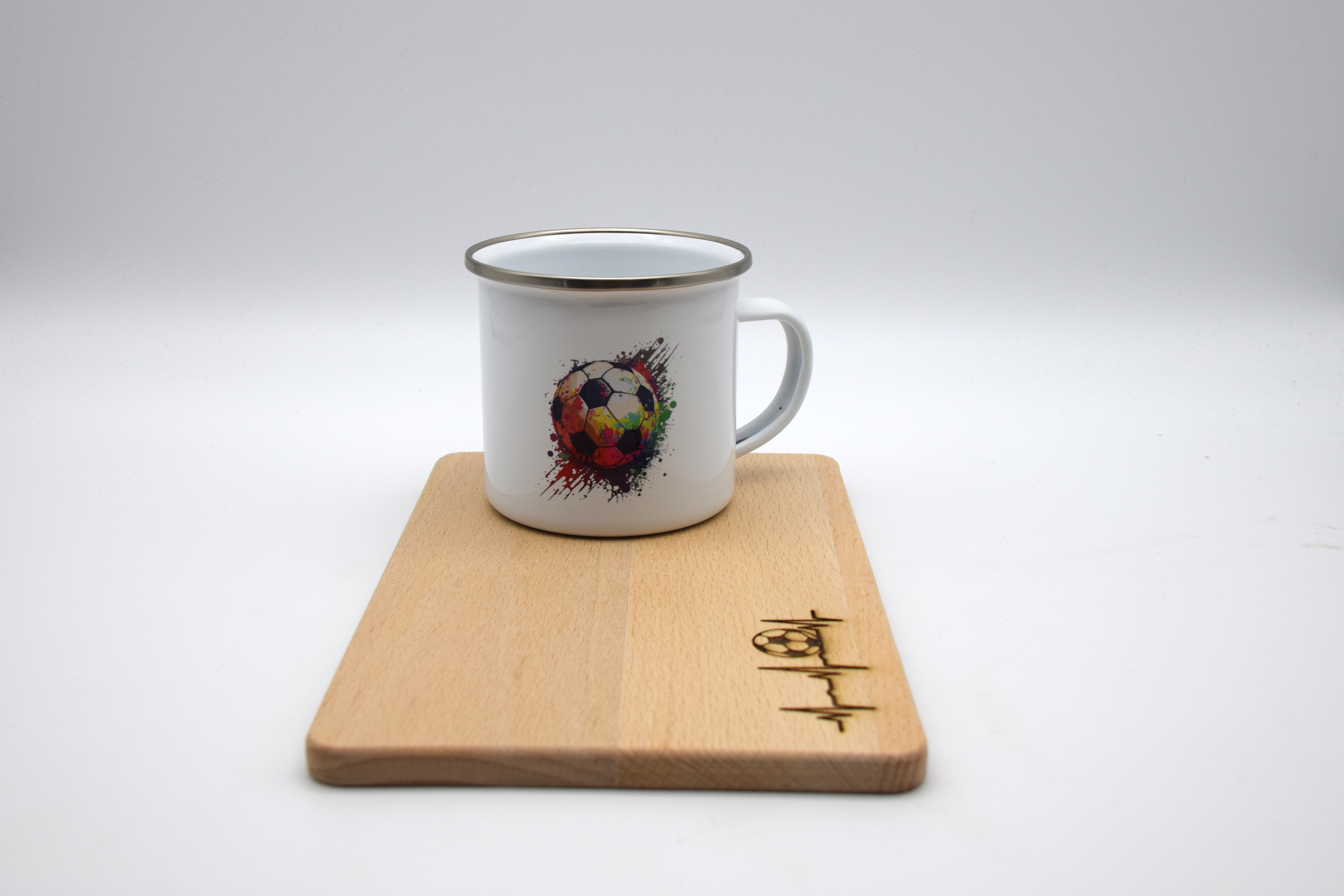 Perfektes Geschenkset für leidenschaftliche Fußballer: das Frühstücksbrettchen mit passender Tasse kann nach Wunsch auch für dich personalisiert werden.