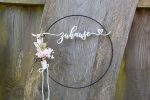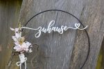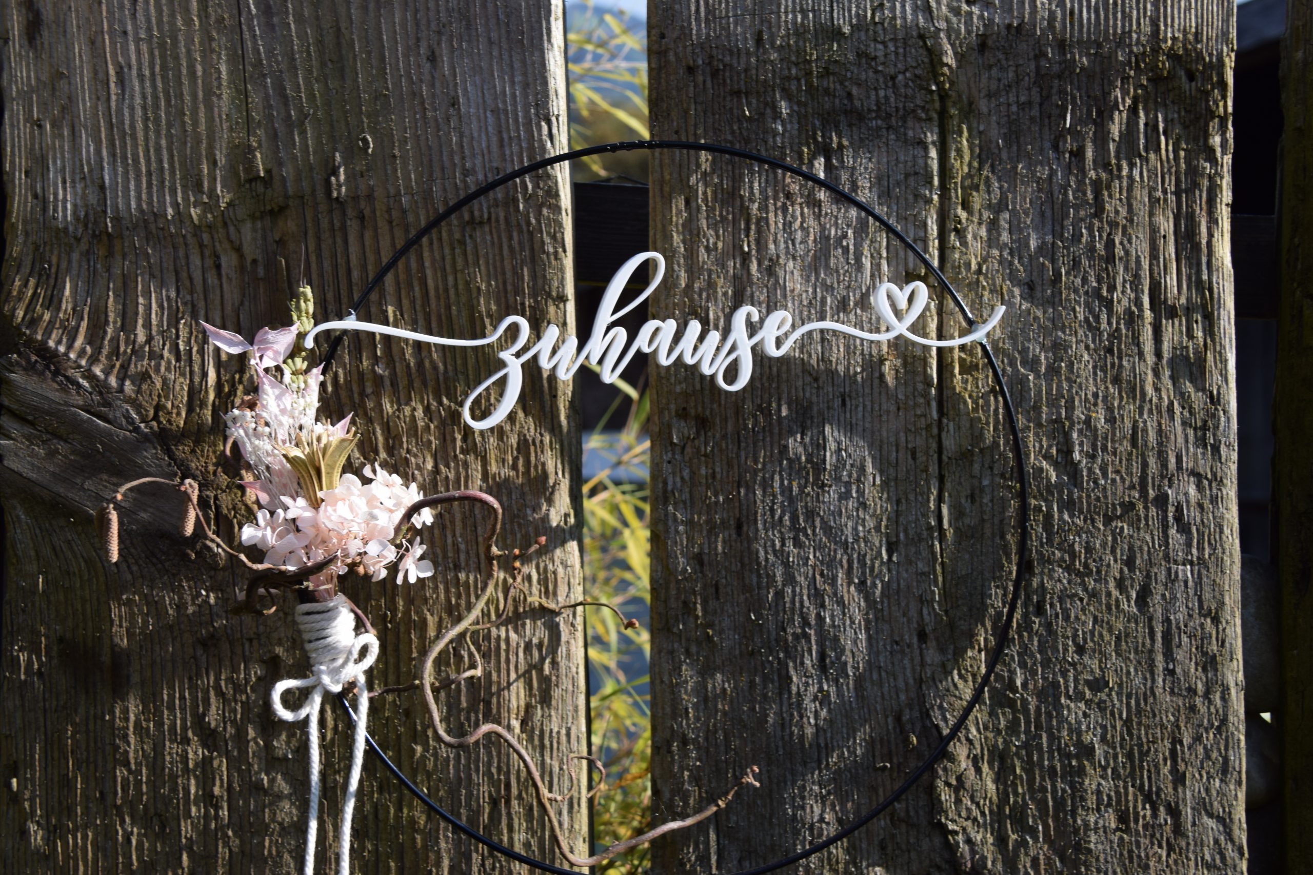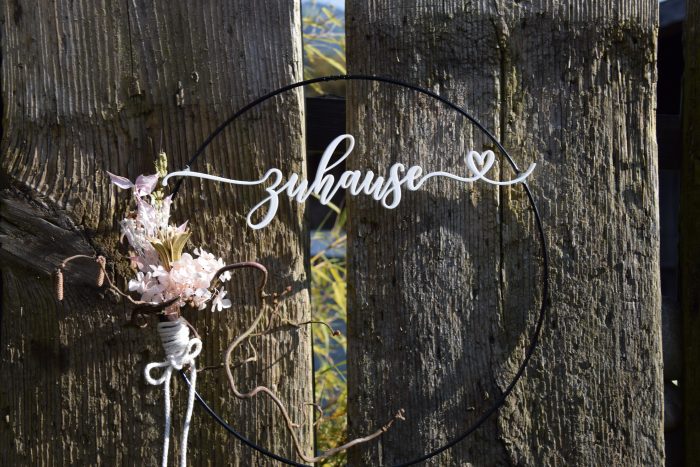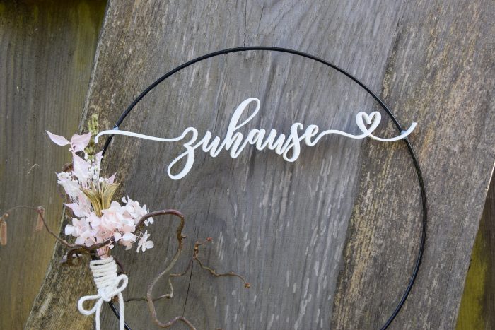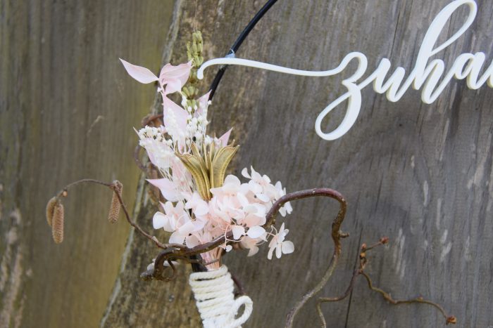 Schlicht eleganter Loop mit 3 D Schriftzug „zuhause“ und Deko aus Korkenzieherhasel-Zweig mit Trockenblumen.