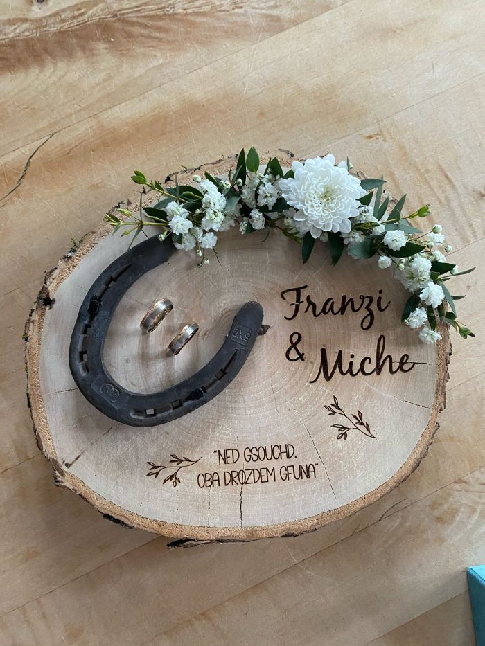 Mit viel Sorgfalt und Liebe zum Detail fertigen wir für euch eine personalisierte Baumscheibe für eure Trauringe. Dieses wunderschöne Hochzeitsaccessoire bleibt auch nach der Trauung eine schöne Erinnerung an den wichtigsten Moment dieses Tages.