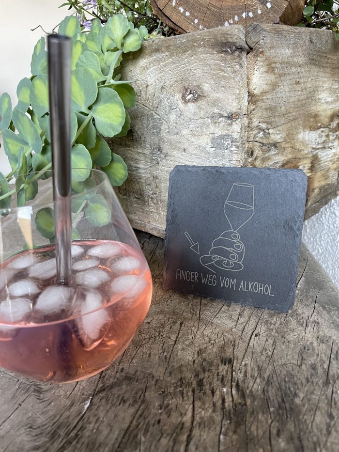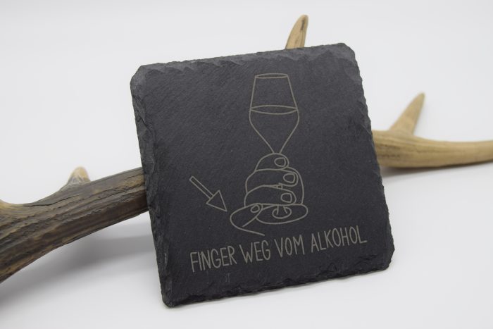 Unser Schieferuntersetzer mit Lasergravur „Finger weg vom Alkohol“ ist ein wunderbarer Begleiter durch einen feucht-fröhlichen Abend. Auf der Unterseite befinden sich rutschfeste Pads.