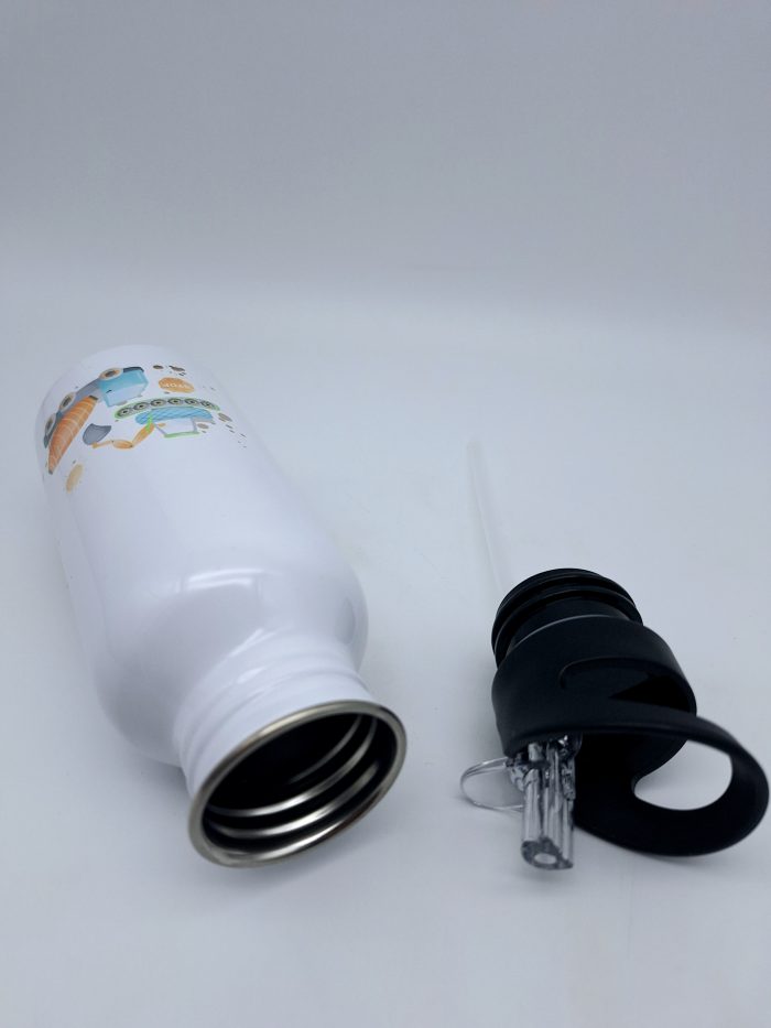 Trinkflasche aus Edelstahl: mit ihrem integrierten Trinkhalm zum Aufklappen und Drehverschluss ist sie besonders für Kinderhände gut geeignet. Ein perfekter Begleiter für Kindergarten oder Schule, zum Sport oder auf dem nächsten Ausflug. Wahlweise in zwei unterschiedlichen Größen erhältlich.
